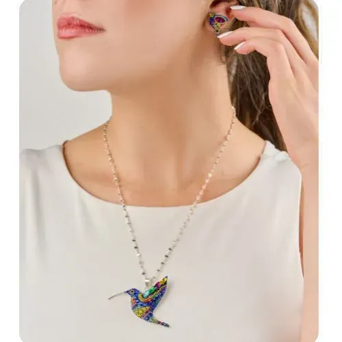 Conjunto de dije y aretes de colibrí, perfecto para agregar un toque de elegancia y estilo a tu look. Hecho con materiales de alta calidad, este juego es ideal para cualquier ocasión y hará resaltar tu belleza de forma sutil y delicada.